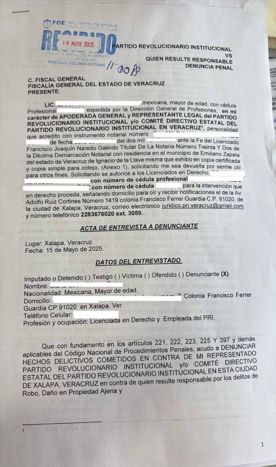 Xalapa, Ver., 16 de mayo de 2025.- El Partido Revolucionario Institucional (PRI) presentó ante la Fiscalía General del Estado de Veracruz (FGE) una denuncia penal contra quien resulte responsable de los presuntos delitos de robo, daño en propiedad ajena, vandalismo y los que resulten por los hechos cometidos en perjuicio de las instalaciones del Comité Directivo Estatal (CDE), el pasado jueves 15.
