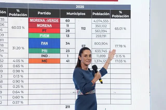 A pesar de los titulares que señalan una disminución del respaldo a Morena en la entidad, Sheinbaum afirmó que a la llamada Cuarta Transformación (4T) “no le fue mal”. “En 2021 se gobernaban 103 municipios, que representaban el 60.03% de la población”, señaló. En este 2025, dijo, la coalición ganó 112 alcaldías y gobernará al 65% de los veracruzanos.