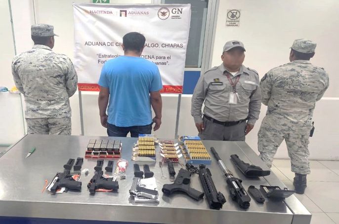 -En Huixtla, elementos de la Guardia Nacional (GN) y Aduanas, al realizar una inspección en el Centro de Atención Integral al Tránsito Fronterizo, Huixtla, detuvieron a una persona, asegurándole un arma larga, tres armas cortas, seis cargadores, 1,250 cartuchos y dos silenciadores.