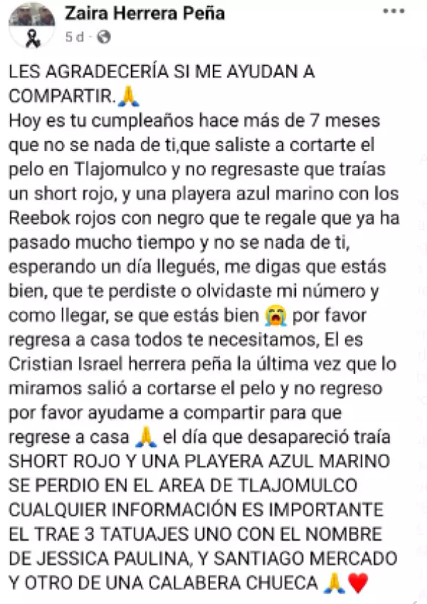 De Jalisco también es originario Cristian Israel Herrera Peña, desaparecido ahí mismo en 2024. Vestía short rojo, playera azul marino y los tenis Reebok rojos con negro que le regaló su hermana, quien no lo deja de buscar: “Por favor, regresa a casa, todos te necesitamos”, suplica, Zaira, su hermana en otro mensaje en redes sociales.
