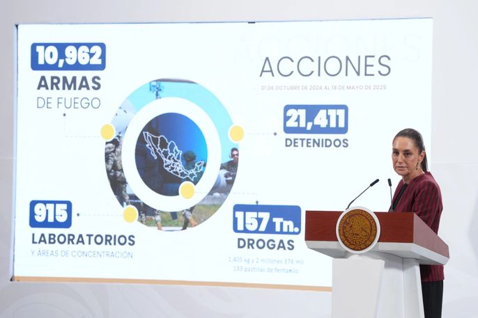 Ciudad de México, .- La Presidenta Claudia Sheinbaum Pardo resaltó que gracias al trabajo permanente, cotidiano y coordinado del Gabinete de Seguridad del Gobierno de México, en conjunto con los estados, del 1 de octubre de 2024 al 18 de mayo de 2025, se han incautado 10 mil 962 armas de fuego y 157 toneladas de droga, se han destruido 915 laboratorios y se han detenido a 21 mil 411 personas por delitos de alto impacto.