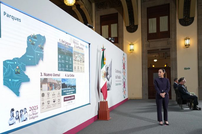Ciudad de México.- La Presidenta de México, Claudia Sheinbaum Pardo, destacó que las obras estratégicas del Gobierno de México, son rentables y contribuyen al desarrollo nacional, ejemplo de ello son el Tren Maya, que a la fecha ha transportado a más de un millón de pasajeros, y su línea de carga será inaugurada a finales de 2026; los Hoteles Mundo Maya y sus parques, que para este verano tiene disponibles 10 paquetes turísticos con precios accesibles; el Aeropuerto Internacional Felipe Ángeles (AIFA), que ha transportado 13.5 millones de pasajeros y mantiene un 90.14 por ciento en satisfacción de pasajeros; el Aeropuerto Internacional de Tulum que ha transportado a más de 2 millones de personas; y la Aerolínea del Estado Mexicano (Mexicana), que tiene un 93 por ciento de satisfacción entre sus pasajeros y a la fecha ha transportado a 600 mil personas.